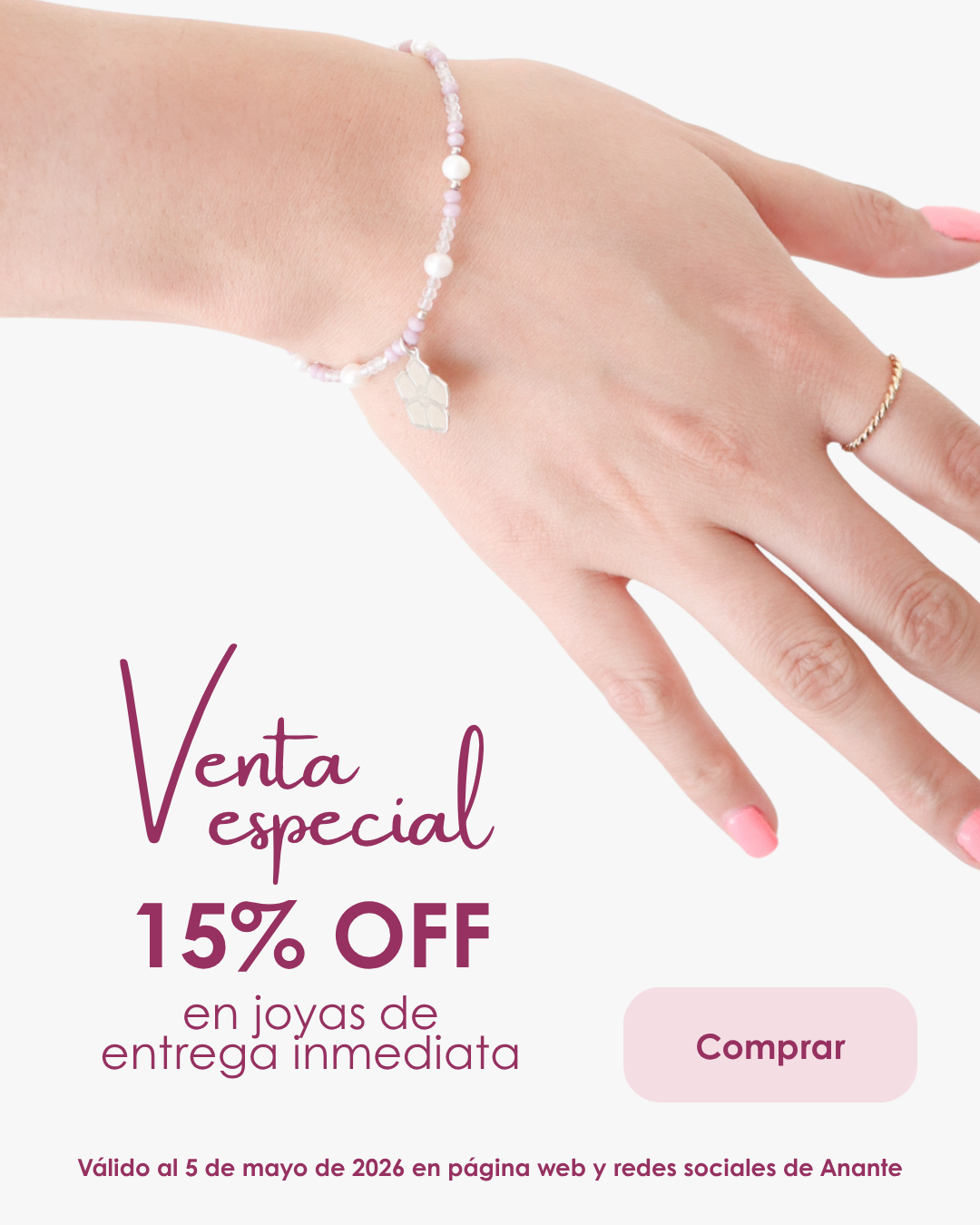 15% descuentoPulsera corazón Amore de cuarzo rosa y perlas