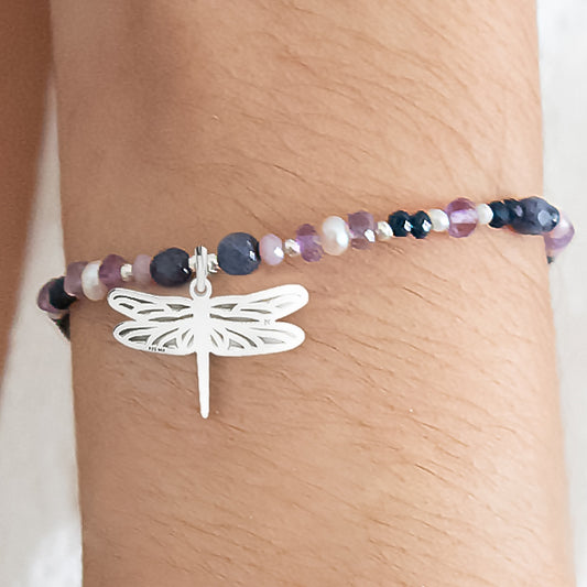 Pulsera Suerte Libélula de plata con piedras y perlas